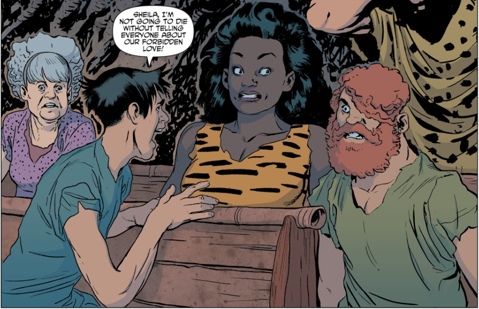 Before I move on to talk about the ongoing plot threads, I’ll mention one more specific story. Issue 4 was the issue I mentioned earlier as the first issue to catch my eye. It involves the new (to them) concept of monogamy and marriage, which many in Bedrock see as unnatural. What they typically use is something referred to as a “sex cave”, which is likely just what it sounds like. This issue brings in the gay marriage debate and we learn more of Fred’s backstory and motivations. Growing up his tribe all had to pitch in to help raise the children, including a gay couple named Adam and Steve. (Which, yes, it’s an easy joke but it got a chuckle out of me.) Fred gives an impassioned speech supporting his old friend’s right to marry, which Reverend Tom believes is a step too far. Fred also has a heart to heart with Wilma, admitting that much of his insecurity comes from feeling like he doesn’t deserve her love and fearing that she’ll leave him.