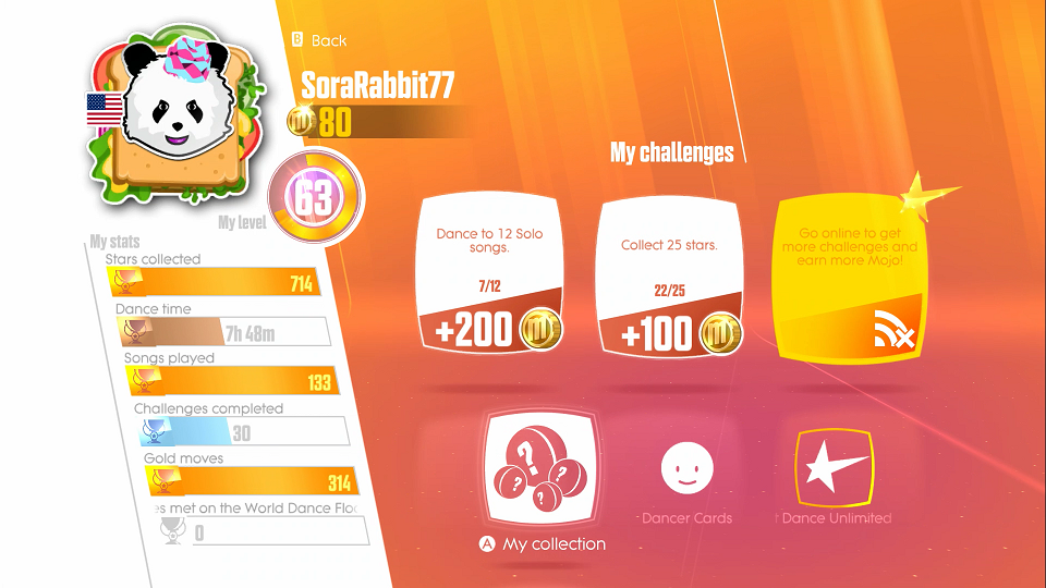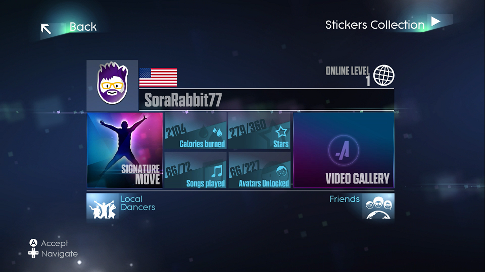 There were several unlockables for the game. I honestly don’t recall how I unlocked stickers… probably playing the songs. The avatars are purchasable for 5 Mojo each, but I didn’t care enough to go through and buy them all. Other avatars are available for reaching different Online Levels (I guess by playing on World Dancefloor, or interacting with others online) all the way up to level 5000. Wow. I wonder if anyone ever reached that. Again, I am frozen at Level 1 forever because the online part is gone. Other avatars were before available by playing in online tournaments and redeeming your Ubisoft points. Both features are gone. (See a pattern here?)