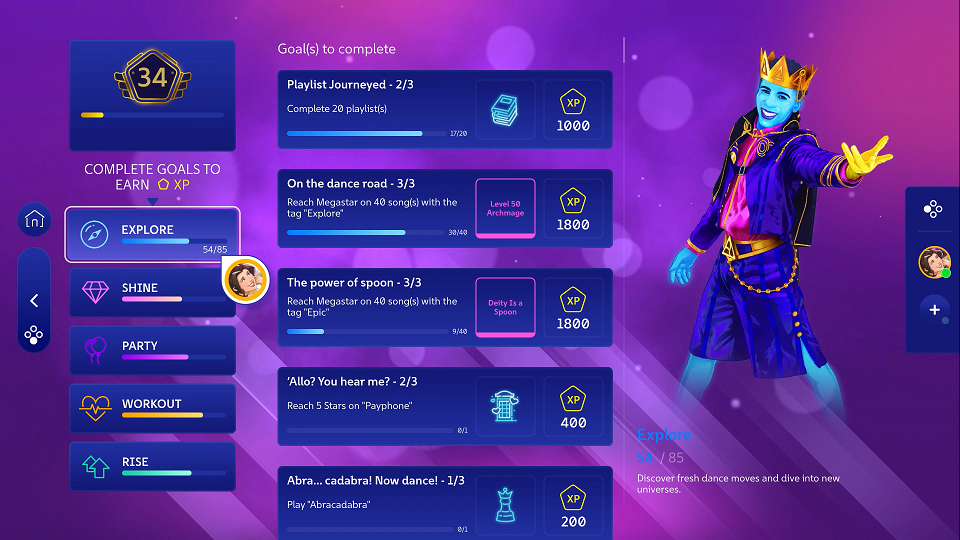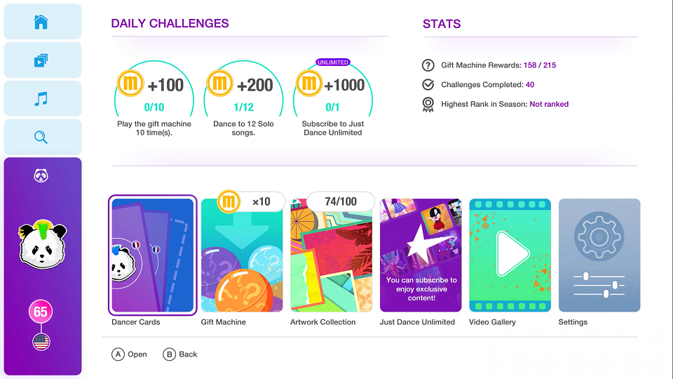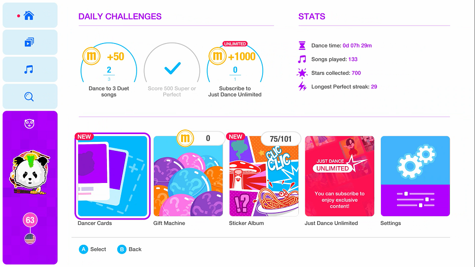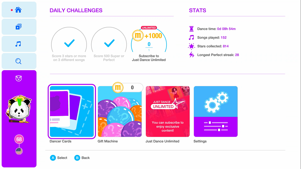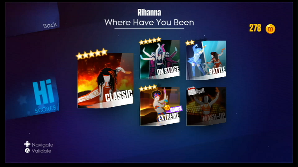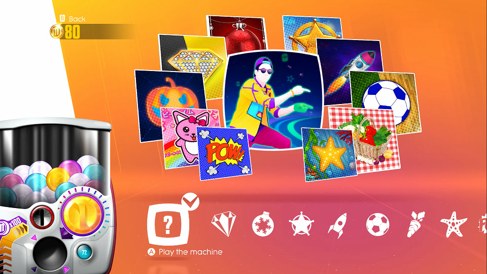 There are Daily Challenges that come up as you start the game, giving you additional tasks to complete for extra Mojo. (Although one of them is always related to UPlay, so really there are only two challenges.) The mojo can be fed into a gift machine, which costs 100 mojo a turn and unlocks alternate songs and other collectibles. Dance Machine was replaced with Dance Lab, where you dance to specific moves through a set amount of time. You unlock episodes of this through the gift machine. There are eight episodes of this available and the ninth, Crazy Lab, randomizes the moves.