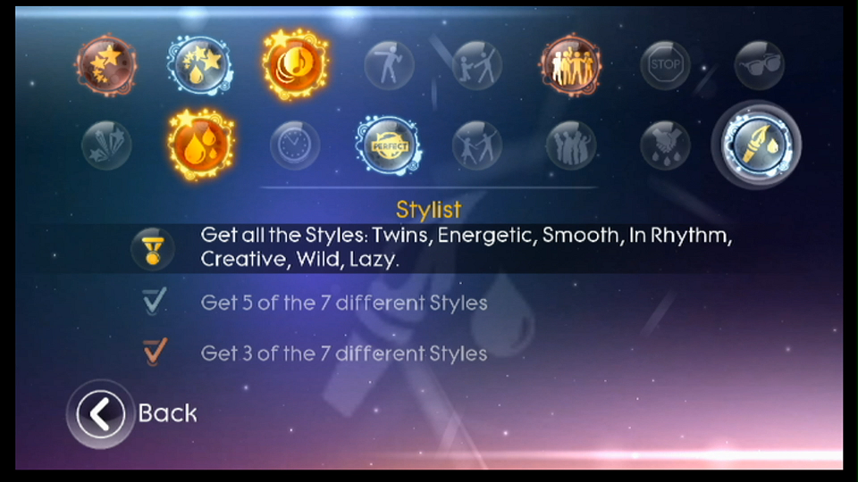 The progression on this edition is in the form of medals. There are three stages of each medal— bronze, silver, and gold. I have two gold (for playing over 150 songs and earning 30,000 Sweat points) 3 silver, 2 bronze, and 9 more I haven’t earned. The other medals are for playing different game modes, doing things in groups, and doing specific things on certain songs.