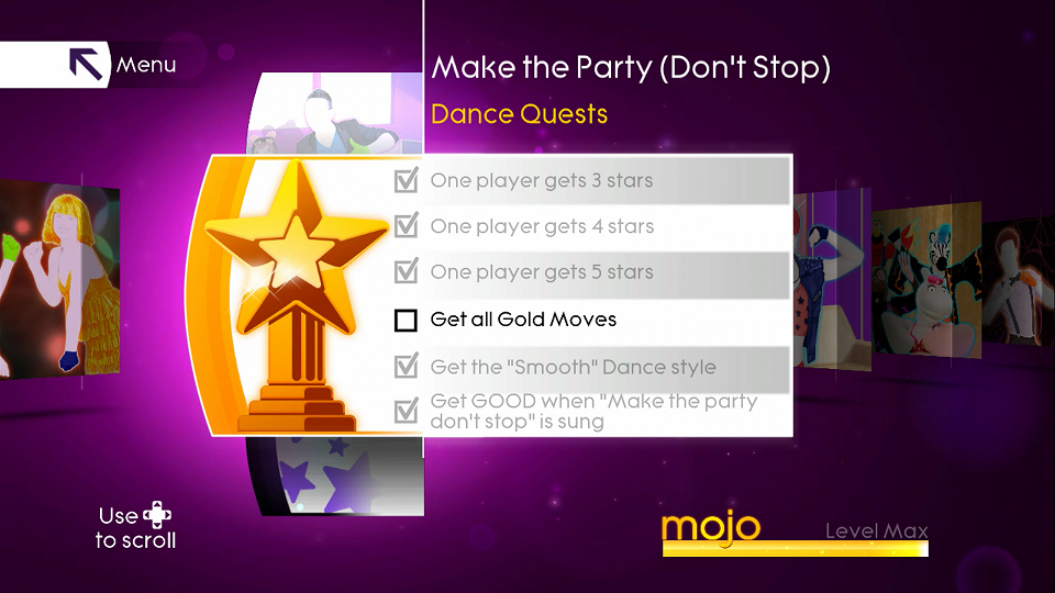 The UI for song selection changed drastically in this one. Here you had to select the song from left to right. Pressing up gave you the alternates that had been unlocked. Pressing down shows scores and Dance Quests. Dance Quests are the method of progression in JD4. You can earn up to six check marks on the card. These are earned by getting a certain number of stars, playing the alt version, getting the gold moves, earning certain dance styles, and getting specific ratings at certain times of the song. My Dance Quest cards average 0 to 4 checks. I have two songs at 5 checks, none at 6.