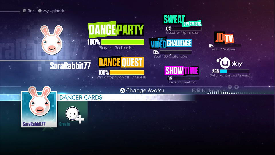 Other new features are the World Video Challenge, which lets you compete against other players online (or at least, it used to let you) and Showtime, which uses the camera in your Gamepad to record videos with different frames around them. I never tried this… the Autodance feature was turned on by default when I started the game and it creeped me out to have my console recording me without my knowledge. Just Dance TV lets you upload videos and watch those uploaded by other players. Ubisoft’s UPlay service was available before discontinuing, and allowed you to unlock more content like in previous games.