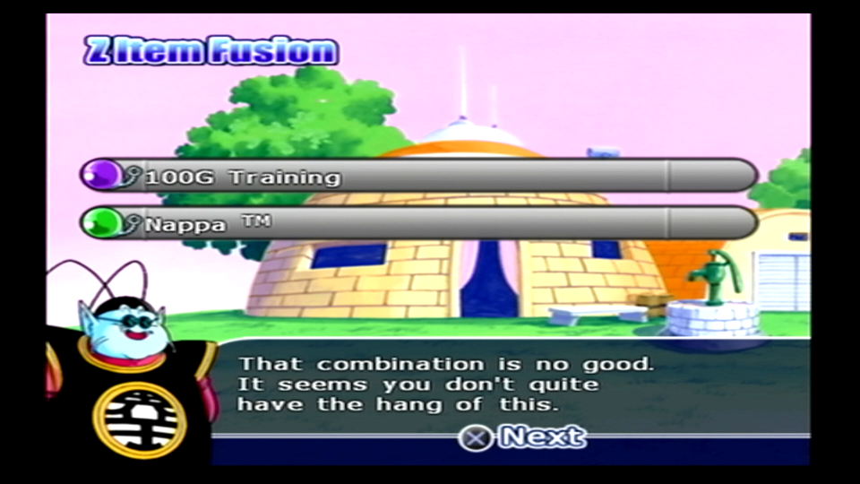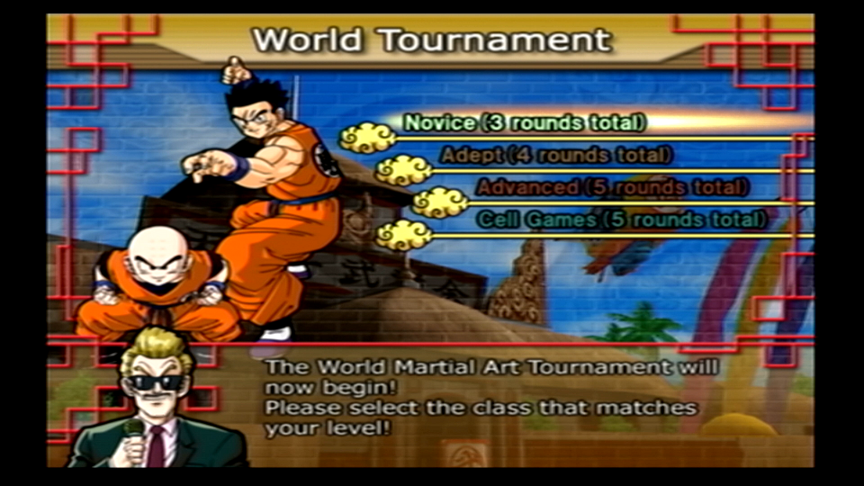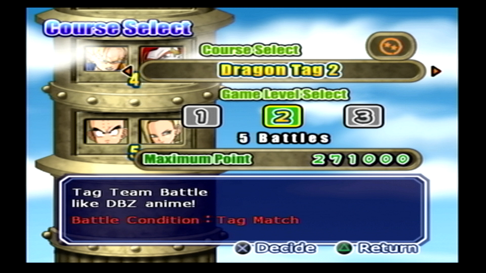 Dragon Tournament is the new name for the World Tournament. (Lame. It’s just the same Budokai as always. Why did it need a dragon-themed name?) The Tournaments are in three modes: World Tournament, Cell Games, and Mister Money Tournament. There are four levels to each and you have to complete all three Tournaments to unlock the next highest level for each one. Winning earns you zeni and potara.