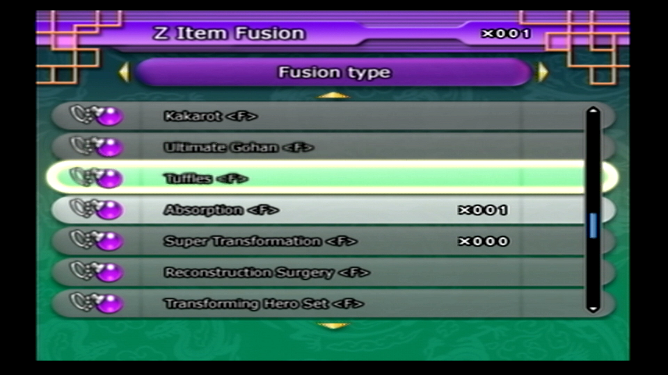 Arguably the most important part of the game for those wanting to fully complete it, is the Z Item Fusion section. Using the purple potara obtained as rewards in Z Battle Gate, you can combine two potara to create new characters and items. You can also fuse the Ability potara, which is the only way to get the higher level stat increases. (Two Attack +3 fuse into an Attack +6, and so on.)