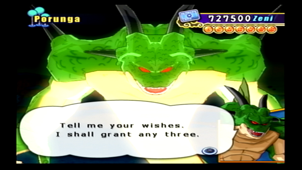 If you summon the dragon on Namek, regardless of where you gathered the Dragon Balls, you get Porunga instead with three wishes. The items available with Porunga seem more common than the ones Shenron gives you. Some of the items are wish-exclusive, but not many.