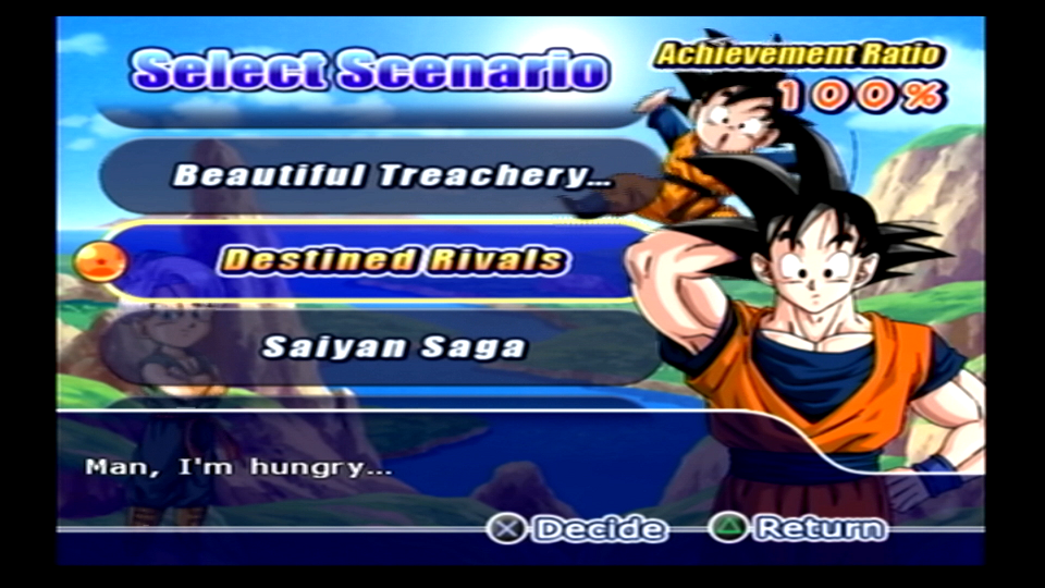 Dragon Adventure is the story mode in this game. As you complete each scenario, you earn new scenarios to play through. Some are available only when doing certain things. (Like defeating Gohan as Goten in the Buu Saga.) This one also allows you to play through several of the movies. While there are still battles where the objective is to survive for a specific amount of time, you can still defeat the opponent and have that count as a win. Most battle objectives are just “defeat the enemy”.